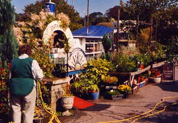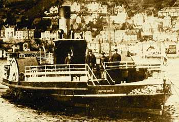 This is the story of a boat, born in 1914, and still alive. Well of sorts. No engine, paddles gone, but afloat and in Truro. She is hemmed in by the bridge taking Morlaix Avenue over the River Kenwyn where in a few yards it meets the River Allen to become the Truro River. The place is Lemon Quay. She faces Lemon Quay Square. On one side Marks & Spencer's looks down, while opposite the bus station is busy. We first met on 27th September, 2000. I was on holiday in the area and had just come out of Truro Cathedral . The day was to include a boat trip from Truro down to Falmouth. Walking down Lemon Street into Lemon Quay Square to the ferry I noticed a colourful display of plants and pots on tables. A Russian vine grew through railings near by and up and over a canopy marked “Entrance”. The structure behind the foliage was topped by a blue chimney with the words “The Deck”. Approaching I saw behind the entrance a gangplank down to a boat. Walking round I could see more clearly an old paddle boat being used as a florists. Painted on the paddle wheel housing ,“P S Compton Castle, Florist”, and in smaller letters, “Built 1914 by Cox and Co Ltd of Falmouth”. There were no paddles under the housing just a panel with a painting of what they may have looked like.