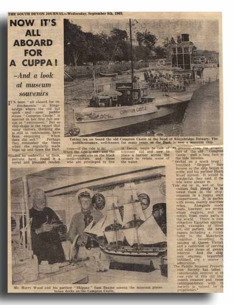 It’s been “all aboard for refreshments” at Kingsbridge where the old but spick-and-span paddle steamer "Compton Castle" is moored in her first full season in " retirement'. But so ship-shape is the vessel that many visitors, thinking she is still in commission, have been enquiring : "When does she sail? Perhaps they remember the times when she regularly made trips up and down the Dart.